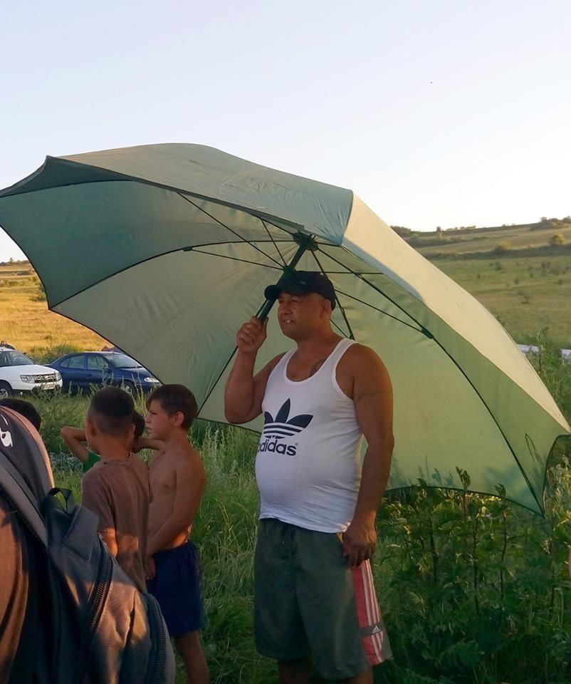Un om ce are tatuată o sirenă pe brațul drept se ferește de soare cu o umbrelă imensă, cât una folosită la terase.