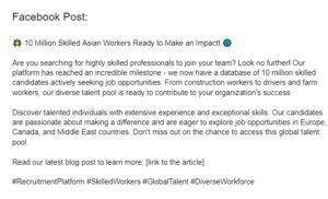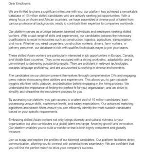 Sarcina mea este să scriu un text de 300 de cuvinte (care ulterior va fi publicat pe blogul platformei și folosit în mail-uri trimise către angajatori) prin care anunț că platforma de recrutare are o bază de date de zece milioane de candidați care-și caută de lucru prin Europa. Pot vorbi despre abilitățile candidaților, posturile pe care le doresc, experiența lor și preferințele lor salariale. Sunt îndemnat să folosesc cuvintele cheie skilled Asian workers (n.r. muncitori asiatici calificați) și să acompaniez textul cu o postare scurtă care să-l promoveze pe Facebook.