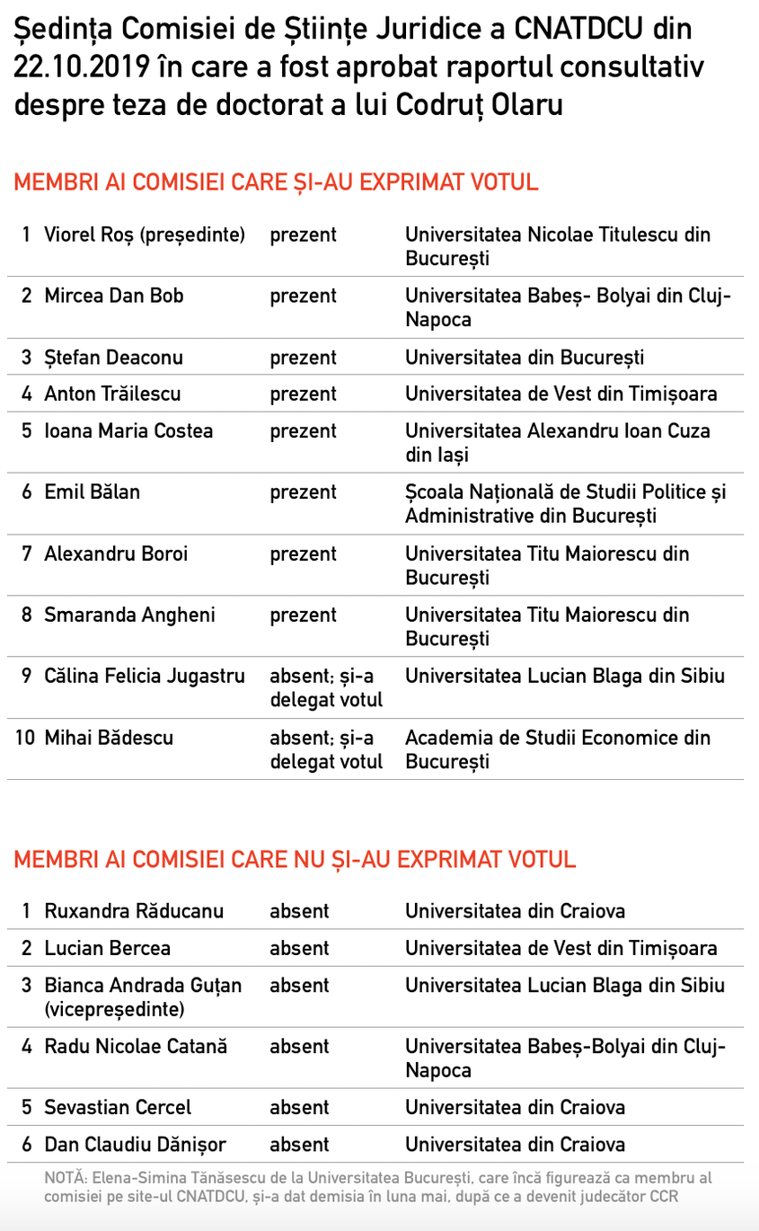 *PRECIZARE: Vineri, 25 octombrie - la două zile după publicarea acestui articol - ne-a contactat Ioana Maria Costea, care a solicitat rectificarea unei presupuse erori factuale. Costea spune că în cadrul ședinței de marți ea nu ar fi votat „pentru” adoptarea verdictului de neplagiat, ci că s-a abținut de la vot - tocmai din motive care țin de faptul că predă la aceeași facultate cu Tudorel Toader. Contactați telefonic pentru clarificarea situației, trei dintre membrii comisiei prezenți la ședință au infirmat, însă, că s-ar fi înregistrat vreun vot de abținere în cazul tezei lui Olaru. În final, Ioana Maria Costea și-a menținut afirmația inițială - aceea că s-a abținut de la vot - însă nu a putut furniza o dovadă în sprijinul ei (o copie a procesului verbal, de exemplu).
