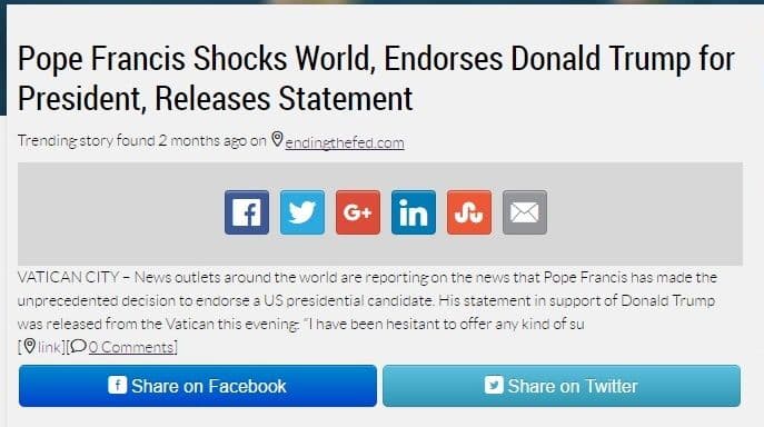 Una dintre știrile false spunea că Papa Francisc și-ar fi anunțat susținerea pentru Donald Trump.