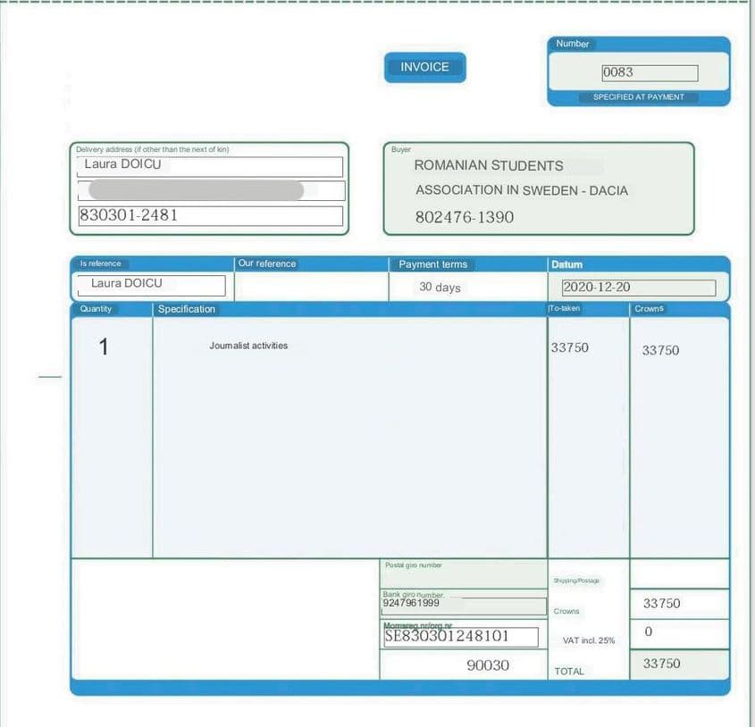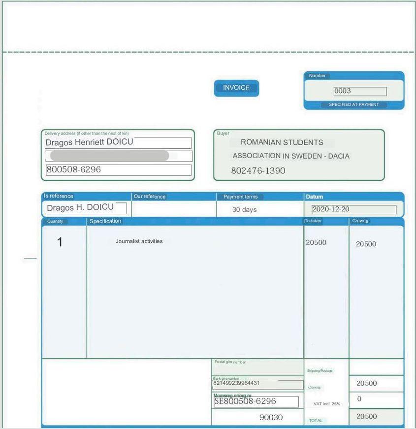 În data de 20 decembrie 2020, ONG-ul l-a plătit pe Dragoș Doicu pentru „servicii jurnalistice” în valoare de 20.500 de coroane suedeze (1.725 de euro), iar pe Laura Doicu pentru servicii de aceeași natură în valoare de 33.750 de coroane suedeze (2.840 de euro). Cei peste 4.500 de euro au fost extrași de familia Doicu prin contractele PFA pe care și le-au făcut cu asociația.