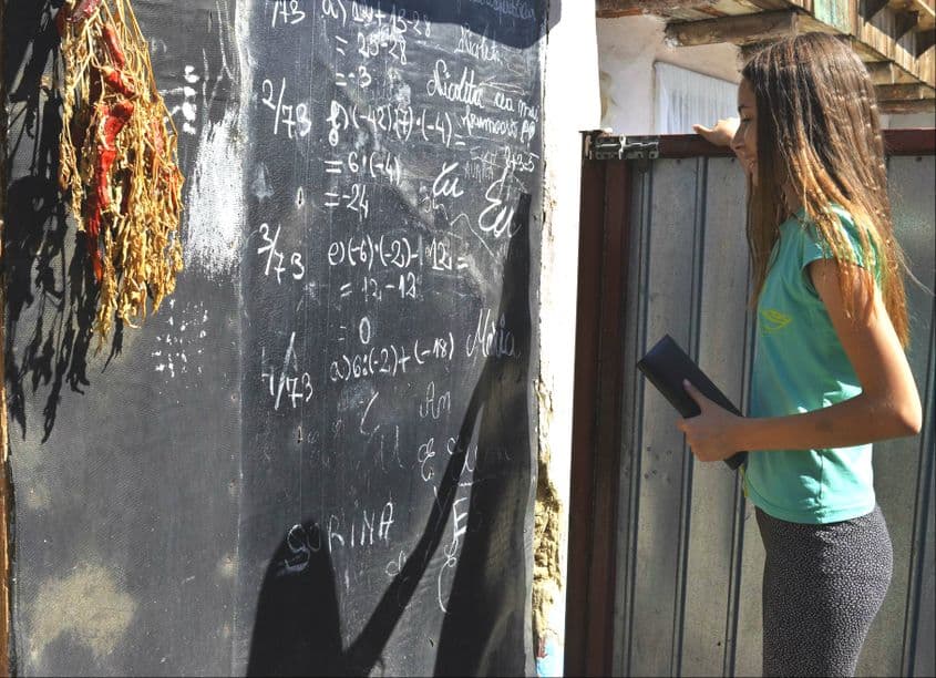 În aceeași ogradă, pe unul dintre zidurile casei, fetele și-au amenajat un soi de tablă neagră, care e acoperită de cifre și de propoziții jucăușe. Una dintre ele – poate chiar ea? – a scris: „Nicoleta este cea mai frumoasă!”
