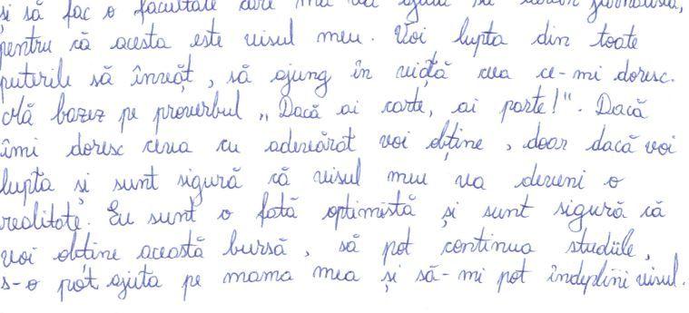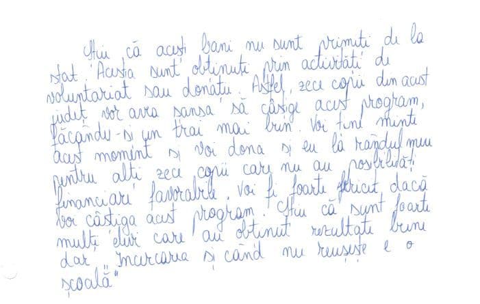 Într-un eseu trimis anul trecut Fundației Comunitare din Galați – fundaţie care ne-a ajutat şi pe noi să-i cunoaștem povestea –, Nicoleta scria: