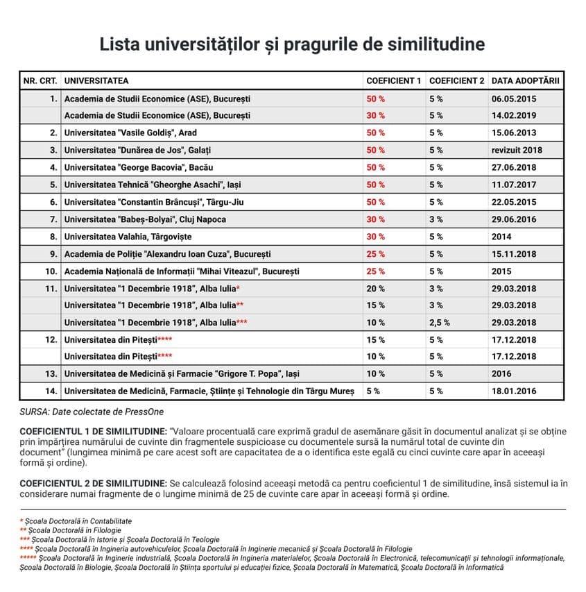 Din datele colectate de PressOne, cel puțin 14 universități românești – aproape o treime din cele circa 50 care au școli doctorale – au adoptat politici antiplagiat prin care au introdus praguri de alertă.