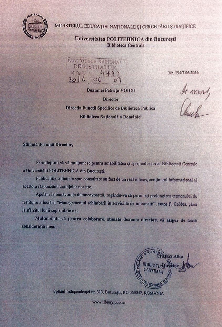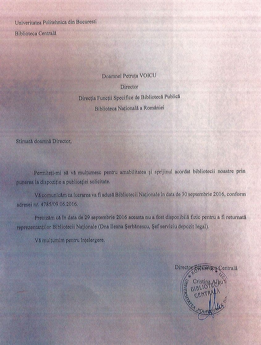 Așa începe adresa care poartă antetul și ștampila Bibliotecii Universității Politehnica. Totuși, deși este semnată de directoarea instituției, Cristina Albu, hârtia nu are un număr de ieșire şi nici ștampila registraturii.