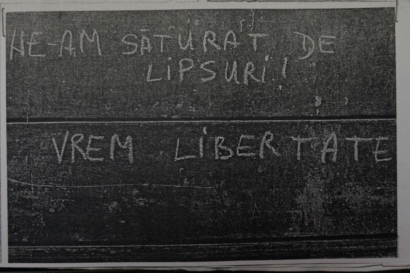 „Ne-am săturat să stăm la cozi interminabile”, răsare pe zidul exterior de la sediul Comitetului Județean al Partidului Comunist Român. La ora 8 dimineața, portarul instituției îndepărtează mesajul cu un rașpel.