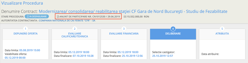 Mai mult, anunțul autorității contractante, în cazul de față, Compania Națională de Căi Ferate CFR S.A., a fost publicat pe site-ul de achiziții publice abia pe 29 iunie 2019, până la acest moment contractul nefiind atribuit nimănui.