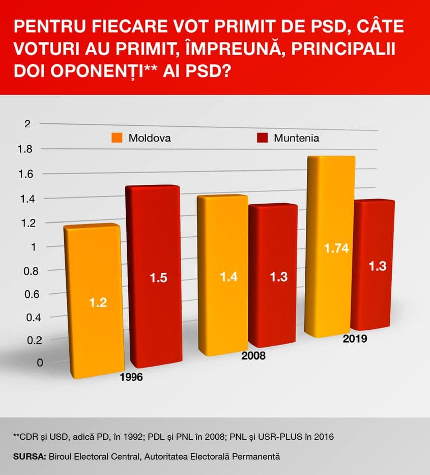 Impactul acestei erodări s-a văzut și în alt fel. Cu trecerea timpului, locuitorii Moldovei au început să-și concentreze voturile către oponenții cei mai puternici ai PSD. Practic, voturile anti-PSD s-au risipit din ce în ce mai puțin spre formațiuni mici și irelevante.
