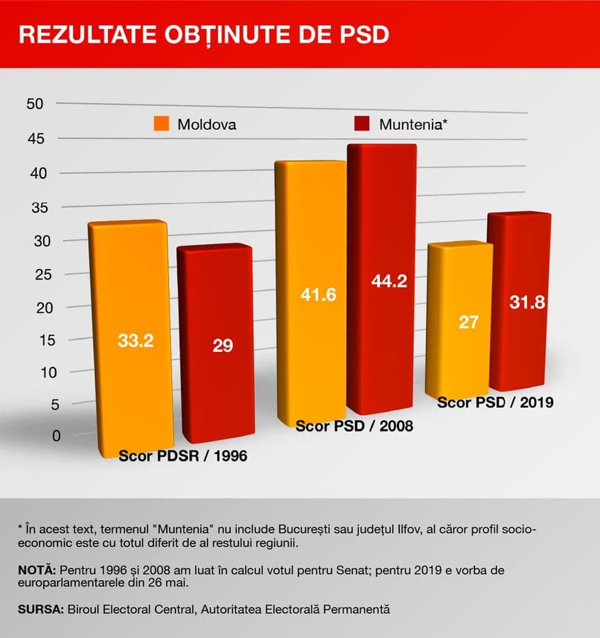 Geografia politică este la fel. În anii ’90, partidul care îl avea drept lider pe Ion Iliescu se baza pe Moldova și Muntenia pentru a obține rezultate bune la nivel național. Cu trecerea anilor, Moldova a devenit mai puțin stabilă în susținerea sa pentru PSD decât Muntenia. În 2019 declinul s-a accentuat, atingând proporții critice.