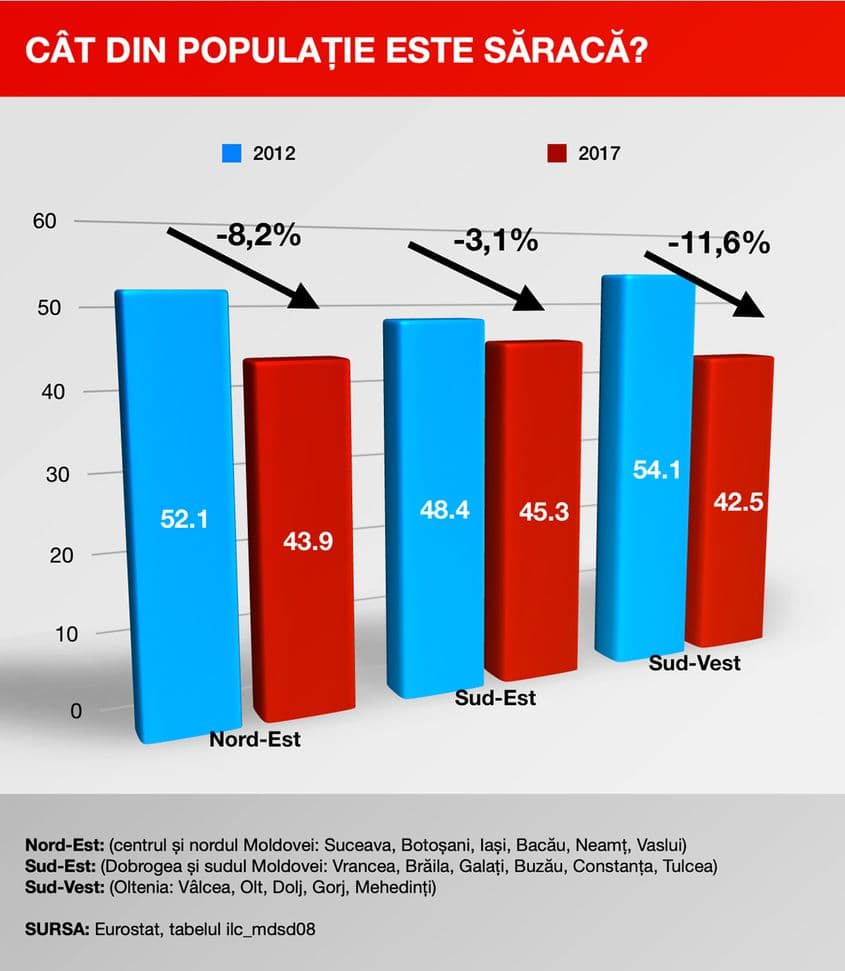 Să ne punem ochelarii de cetățeni europeni. Uniunea folosește conceptul „deprivare materială și socială severă” pentru a descrie o realitate chinuitoare: ai bani doar de mâncare și facturi. Între 2014 și prezent, din 100 locuitori ai Moldovei care se aflau în această situație 12 și-au îmbunătățit nivelul de trai – în Muntenia doar 4 din 100. Dar hai să vorbim despre sărăcie pur și simplu – aceasta însemnând un venit mai mic de 60% din cel median la nivel național. Regiunea Nord-Est a României, adică Iași, Bacău, Neamț, Botoșani, Suceava și Vaslui, a fost timp de aproape un deceniu regiunea din România cu cea mai mare pondere a oamenilor săraci. De fapt, situația sa a evoluat într-un mod benefic, în 2017 devenind din acest punct de vedere superioară celei a Olteniei.