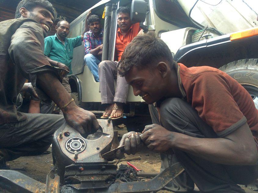 Deși lucrează duminica, băieții coordonați de mecanicul șef Perumal și supravegheați de nelipsiții băgători de seamă sunt comunicativi, harnici și binedispuși.
