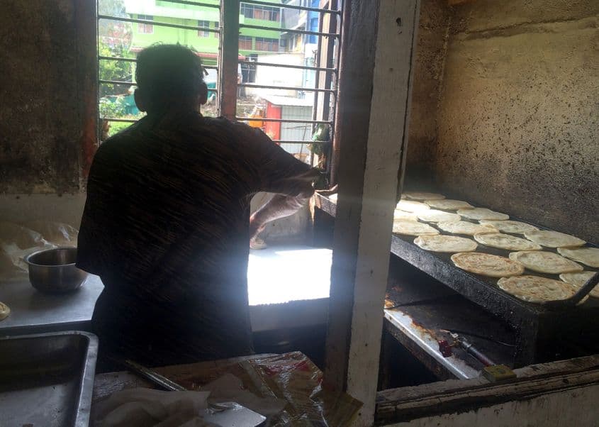 Într-un spațiu infim și plin de fum, omul face paratha – un fel de plăcinte nedospite coapte pe plită. Le bate de masă, le împăturește și le sucește cu o precizie de ceasornic elvețian.