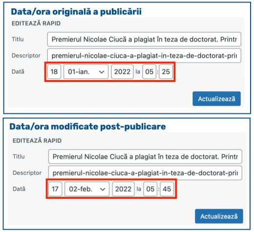 Iată, de pildă, cum data materialului despre plagiatul premierului Nicolae Ciucă poate fi schimbată din 18 ianuarie 2022, ora 05:25 dimineața, în 17 februarie 2022, ora 05:45 dimineața: