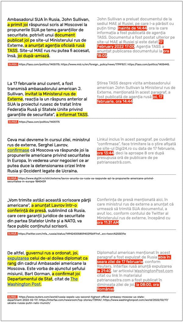 Mai jos, în coloana din stânga, fragmente din materialul patrianoastra.com care fac referire la evenimente care s-au petrecut la 17 februarie 2022, dar după 05:35, presupusa oră a publicării. În coloana din dreapta, orele la care s-au produs în realitate evenimentele: