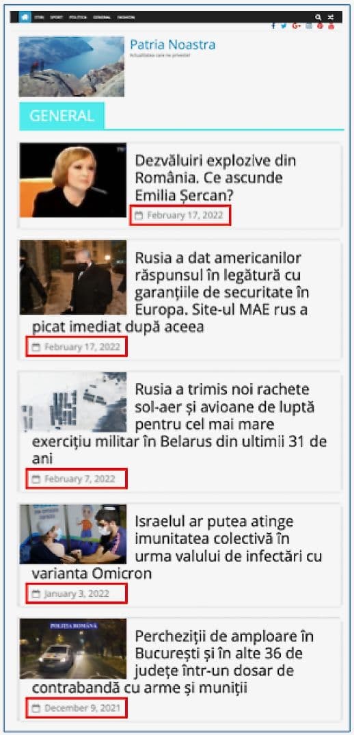 Prima mea constatare: la categoria GENERAL apăreau două materiale datate 17 februarie: unul cu «dezvăluirile explozive» despre Emilia Șercan (care includeau captura de ecran), și celălalt intitulat «Rusia a dat americanilor răspunsul în legătură cu garanțiile de securitate în Europa. Site-ul MAE rus a picat imediat după aceea». Anterior, de la începutul lui 2022, patrianoastra.com mai postase doar două materiale, ambele cu subiecte externe: unul la 7 februarie și unul la 3 ianuarie.