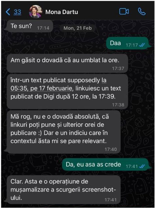 Potrivit experților celor două instituții, care mi-au analizat datele telefonului în integralitate, nu a fost descoperită nicio dovadă de spyware sau hacking, care ar putea explica faptul că acea captură de ecran mi-ar fi fost sustrasă din dispozitivul electronic în noaptea de 16 spre 17 februarie.