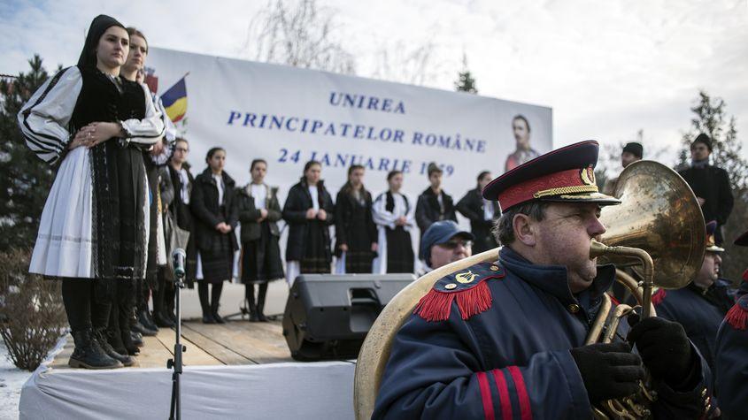 Muzicanții din Petrești se grupează lângă scena din centrul orașului Sebeș. La semnalul dirijorului, vor interpreta imnul național și un cântec patriotic.