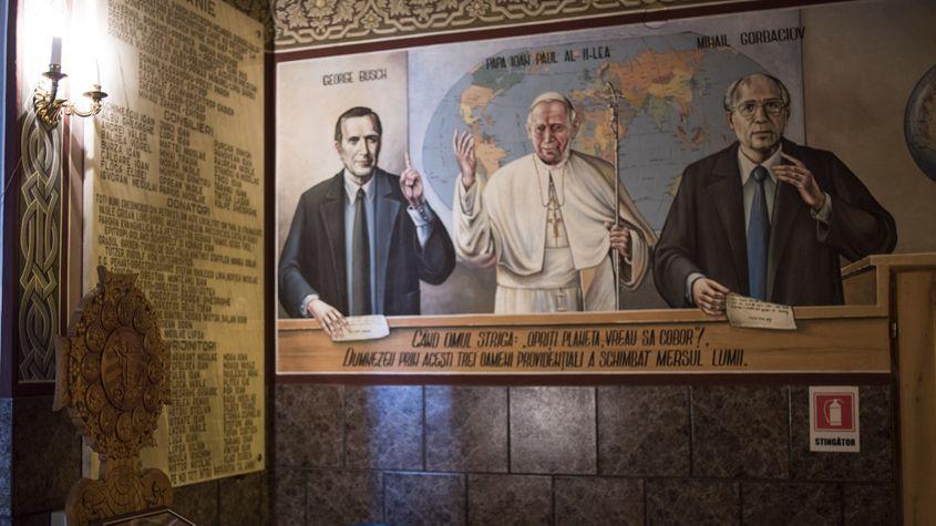 În pridvorul bisericii „Schimbarea la Față” din Petrești, de pe peretele din stânga, cum intri, te privesc Papa Ioan Paul al II-lea, alături de Mihail Gorbaciov și George Bush-tatăl, care conduceau URSS, respectiv SUA în 1989.