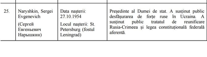 Serghei Evghenevici Narîșkin (61 de ani) se află din 2014, după anexarea Crimeei de către Rusia, pe lista persoanelor care au interdicție de intrare în Uniunea Europeană.