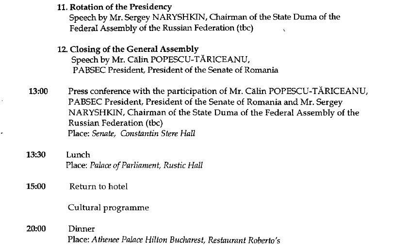 Din acel draft se poate observa că programul Sesiunii din 27 noiembrie fusese redactat la Istanbul încă din 20 august. În desfășurător figura inclusiv momentul discursului pe care Narîșkin avea să-l susțină în plenul Sesiunii de la București.