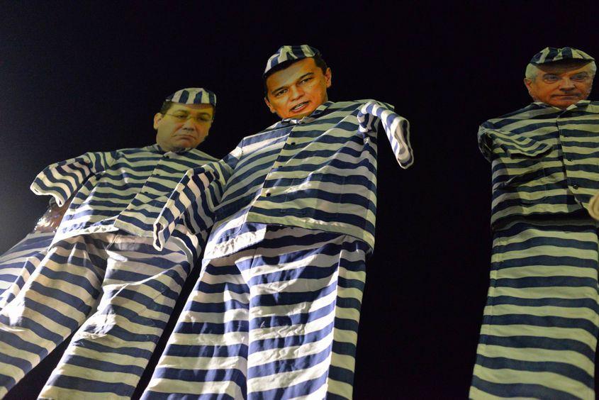 Ministrul Justiției – Florin Iordache, premierul Sorin Grindeanu, Liviu Dragnea, Ion Iliescu, Călin Popescu-Tăriceanu și Victor Ponta plutesc, în celebra uniformă în dungi a deținuților, deasupra mulțimii.