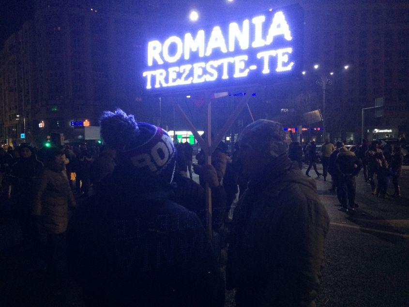 Doi tineri se plimbă cu o firmă luminoasă pe care rulează mesaje precum „Corupția ucide” sau „România, trezește-te”. Este improvizată de un inginer în vârstă de 34 de ani.