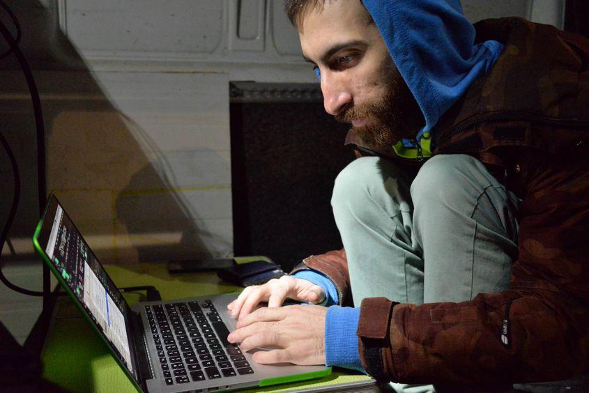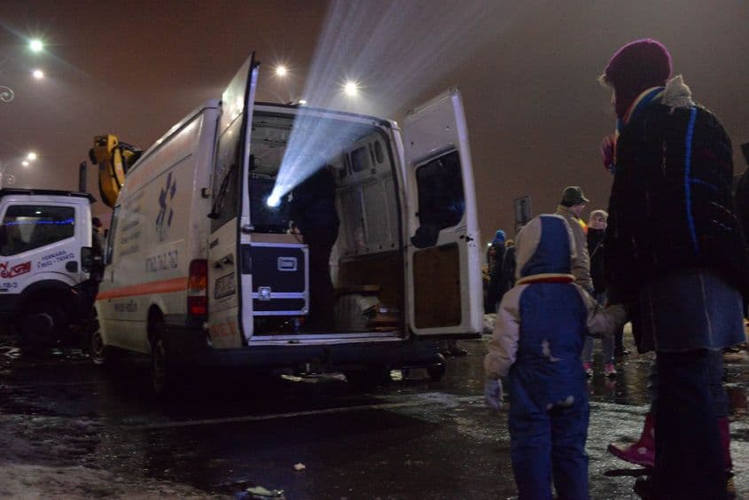 Am vrut să vedem cine sunt tinerii de la Aural Eye, autorii proiecţiilor laser din Piață. I-am găsit într-o ambulanță veterinară – singurul vehicul pe care l-au putut împrumuta pentru protest.