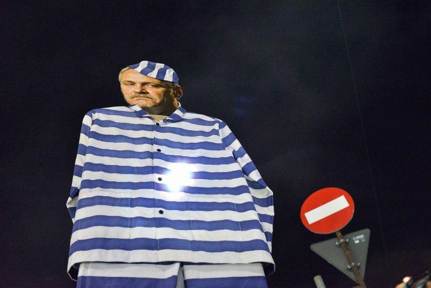 Câțiva bărbați poartă șirul de paiațe dintr-un capăt în altul al Pieței, trecând printre oamenii care le deschid calea. „Uite, Dragnea se uită la mine!”, spune cineva.