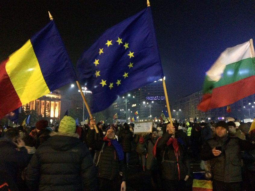 În partea cealaltă a pieței, în fața unor care de televiziune, trei bărbați aliniați flutură steagurile României, al Uniunii Europene și al Bulgariei.