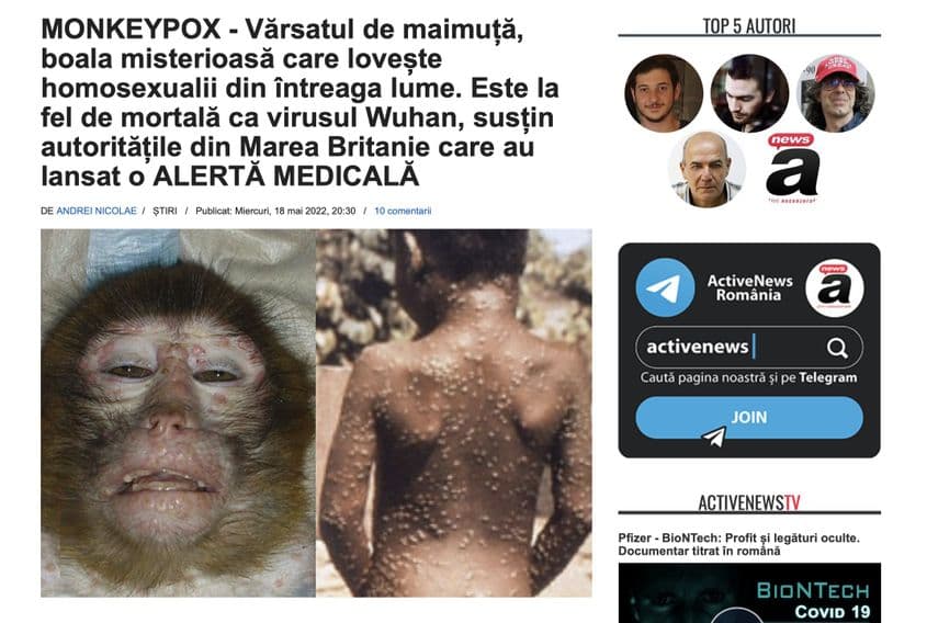 Fake News / Dezinformare: Variola maimuței este încă o încercare a elitei globaliste de a controla omenirea, un virus de laborator răspândit doar de persoane homosexuale, o consecință a vaccinului anti Covid, o armă biologică produsă în Ucraina sau o răzbunare a lui Dumnezeu.