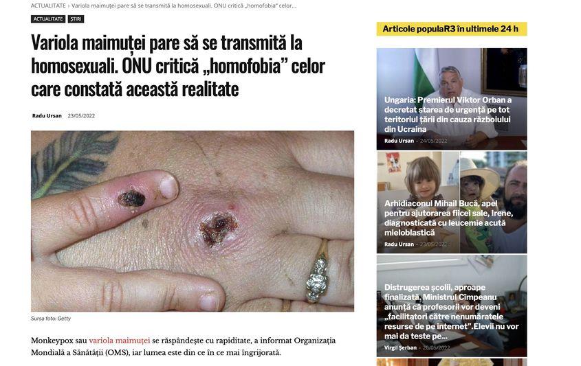 „Variola maimuței pare să se transmită la homosexuali. ONU critică «homofobia» celor care constată această realitate”, titrează R3media.ro, pe 23 mai.