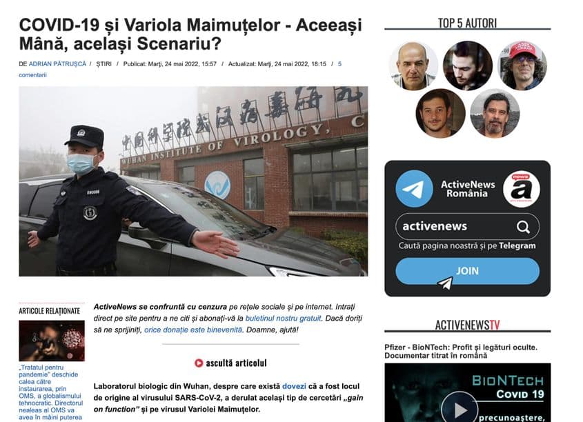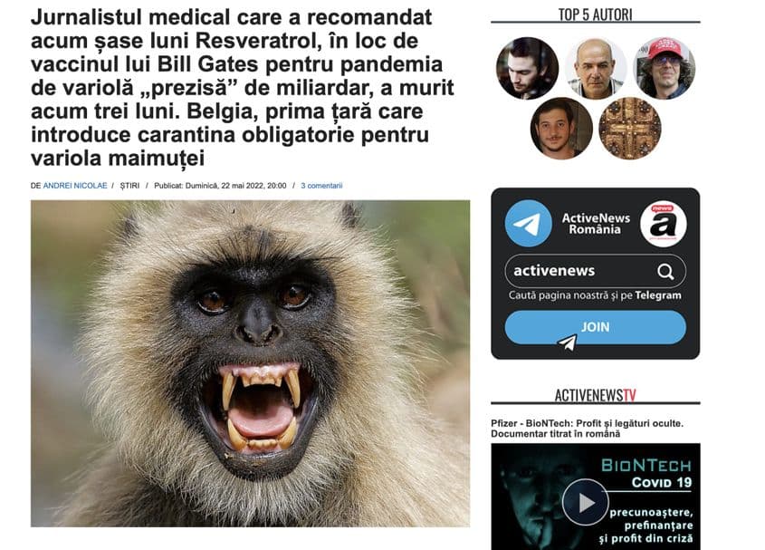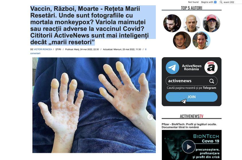 „Vaccin, Război, Moarte - Rețeta Marii Resetări. Unde sunt fotografiile cu mortala monkeypox? Variola maimuței sau reacții adverse la vaccinul Covid? Cititorii ActiveNews sunt mai inteligenți decât «marii resetori»”, plusează, pe 24 mai, site-ul de dezinformare.