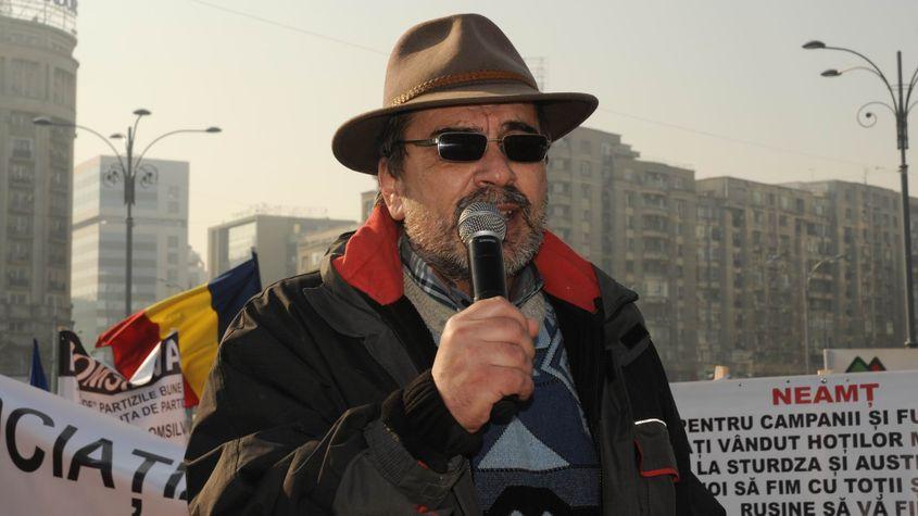 Petru Mitocaru (56 de ani) a nădușit strigând pe scena improvizată în Piața Victoriei, așa că își trage sufletul câteva clipe, cu microfonul în mână.