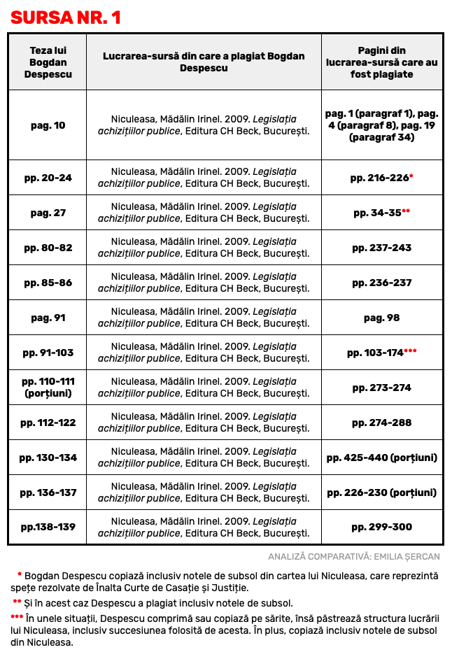 43 de pagini din teza lui Bogdan Despescu sunt plagiate din cartea „Legislația achizițiilor publice”, semnată de Mădălin Irinel Niculeasa și apărută în anul 2009 la Editura CH Beck.