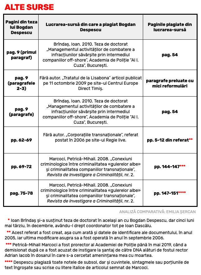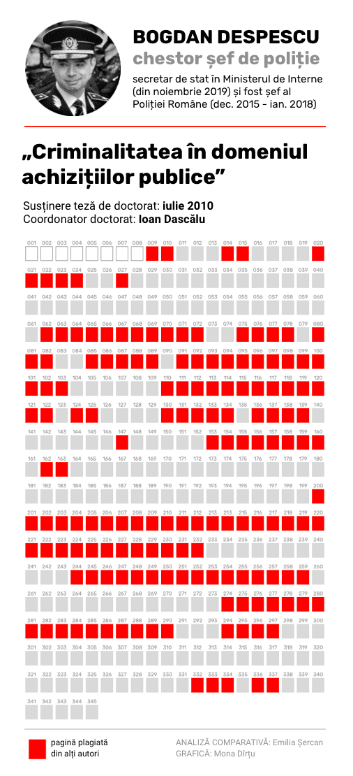Numărul 2 din Ministerul de Interne - numit în funcție la 29 noiembrie 2019 - a folosit cel puțin patru surse bibliografice majore pentru a copia în teza de doctorat. De exemplu, dintr-o carte scrisă de un fost profesor de la Academia de Poliție, Despescu a plagiat nu mai puțin de 77 de pagini.