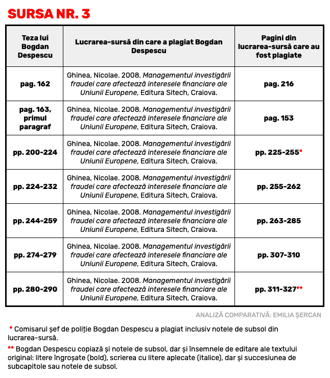 - 77 de pagini din lucrarea științifică a chestorului șef Bogdan Despescu sunt copiate dintr-o singură carte: „Managementul investigării fraudei care afectează interesele financiare ale Uniunii Europene”, apărută în anul 2008 la Editura Sitech și semnată de Nicolae Ghinea.