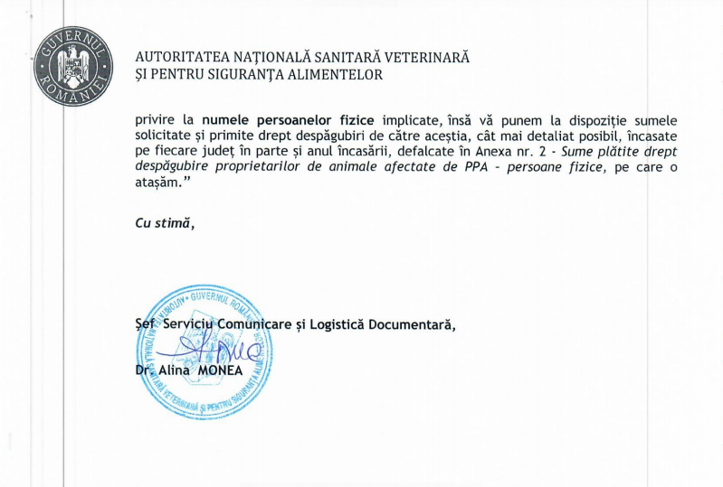 Aceste companii, ale căror nume ANSVSA le trecea la "date personale" încasaseră, până în martie, 2019, peste 193 de milioane de lei despăgubiri, din bani publici, după ce sacrificaseră porcii depistați ca fiind purtători ai pestei porcine. Doar în 2018, peste 360.000 de porci au fost sacrifcați în România. (Detalii despre cum a reacționat România în timpul epidemiei de pestă porcină puteți citi aici și aici).