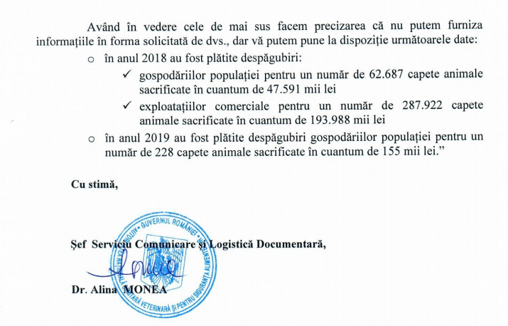 În total, în 2018 și 2019, ANSVSA a plătit 258 de milioane de lei despăgubiri către companii, și alte 74,3 milioane de lei către persoane fizice. Numele acestora sunt în continuare considerate date care nu sunt de interes public.
