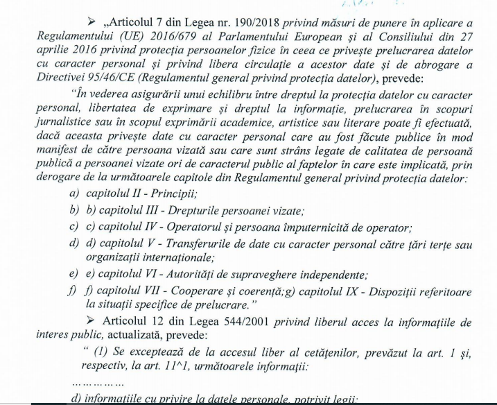"Informațiile de interes public sunt definite de Legea nr. 544/2001 ca fiind informațiile care privesc activitățile sau care rezultă din activitățile unei autorități publice sau instituții publice, indiferent de suportul ori de forma sau de modul de exprimare a informației. Aceeași lege definește datele personale ca fiind informațiile privind o persoană fizică identificată sau identificabilă.