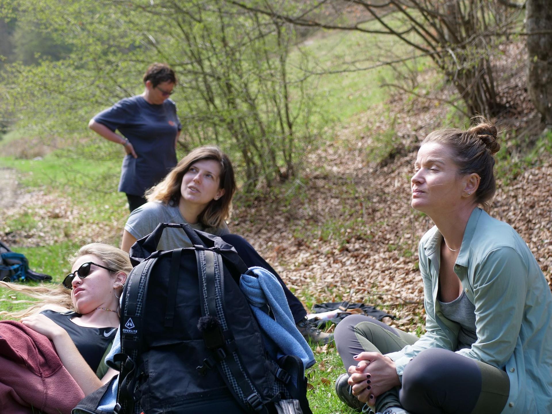 Înainte de asaltul final, fetele s-au tolănit un pic lângă un pârâu așteptând ca sufletele să le ajungă un pic din urmă. Via Transilvanica e o provocare, dar este una care știe și să-l răsplătească pe drumeț. Nu e tocmai de colea ca, într-o zi oarecare a săptămânii, nici nu mai știi care, să zaci într-un mic colț de rai cu un pai în gură, și cu capul sprijinit de rucsac urmărind, cu ochii mijiți, mișcarea leneșă a norilor, în timp ce asculți curgerea unui pârâiaș.