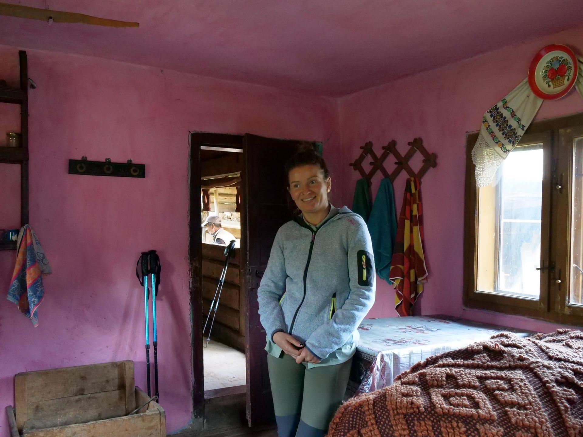 Dar Nea Costică e molcom, nu se grăbește. Sprijinit în toiag, ca un patriarh, ne conduce la un alt sălaș, mai jos, unde vom sta singuri într-o căsuță mică și veche, cu pământ pe jos și cu pridvor, parcă ruptă din Moromeții. Are în jur garduri de lemn, curticică interioară cu laviță și șopru de fân. Camera e toată roz, plină de ștergare și icoane, absolut minunată.