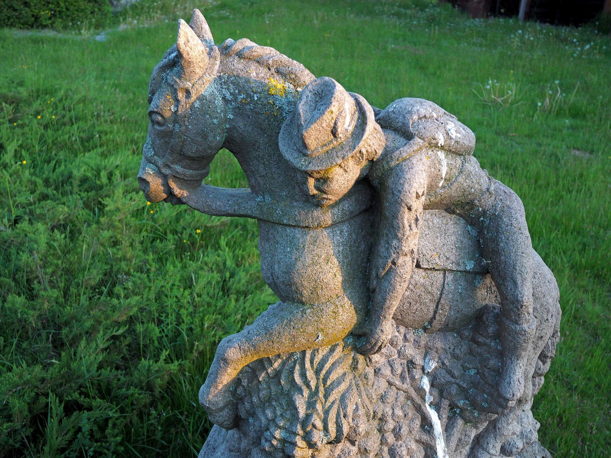 În mijlocul curții elementul cheie e o fântână cu cumpănă și postament de piatră împodobită toată de ghivece din plastic alb din care răsar cu flori roșii. De ea atârnă, decolorat, un tricolor. În spatele fântânii e un hambar lângă care tronează o antenă rotundă, un calorifer și un fotoliu dezafectat pe care fraternizează o mâță gri și un vechi tv alb negru. Superb!