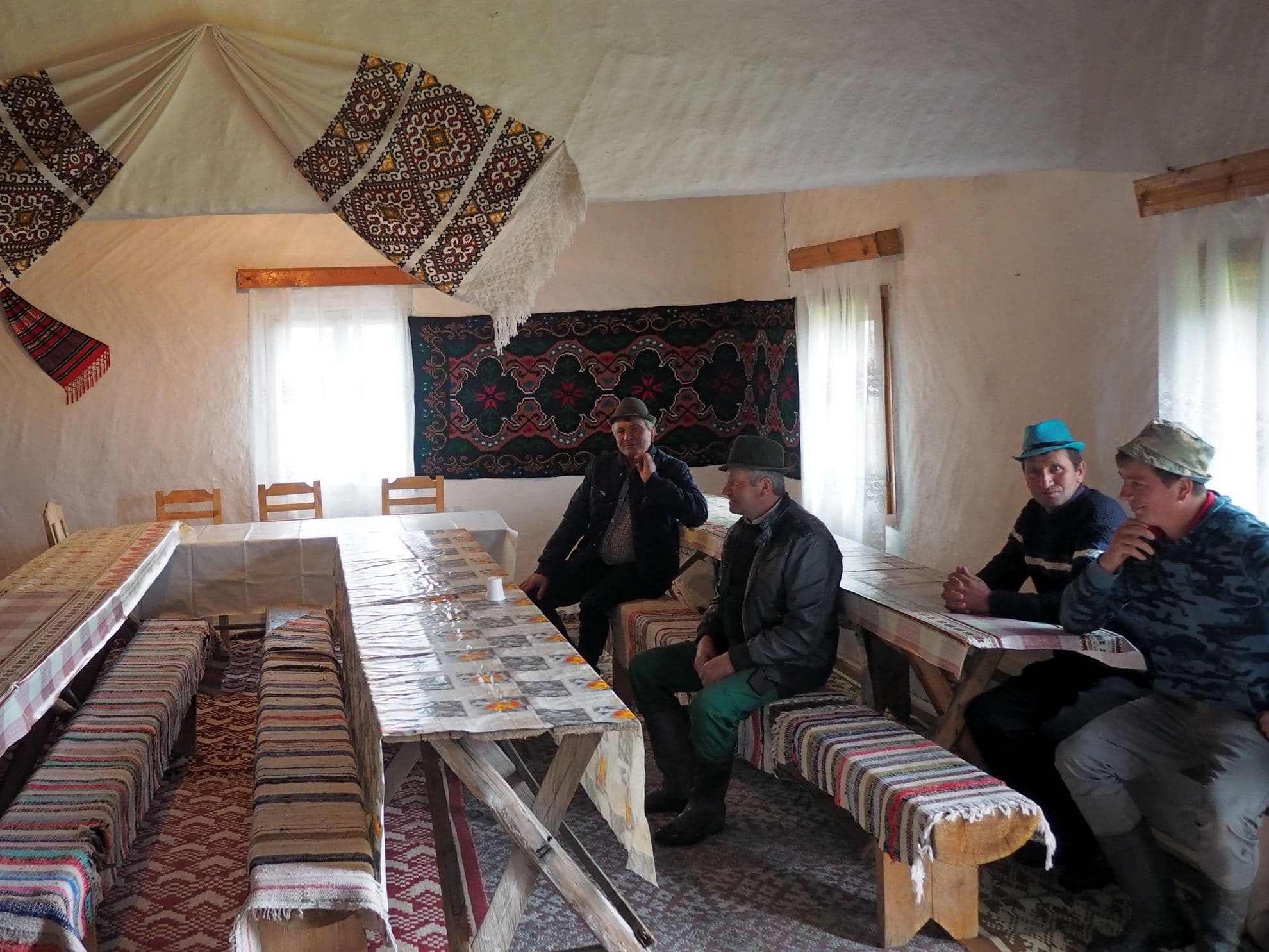 I-a convocat preotul paroh ortodox Liviu Tomoroga la casa de oaspeți. Casa e mare, de lemn, cu sobă de tablă, mese lungi de scândură și ștergare pe paturi și pereți - e ideală pentru botezuri, cumetrii sau chiar pentru găzduit drumeți rătăciți. Deși afară plouă îndesat, au venit o mână bună de oameni, îmbrăcați frumos, doar e duminică. Stau tăcuți și sobri, ca toți muntenii, răsfirați frumușel, unul dintre ei are pe cap o pălărie albastră, tare șic.