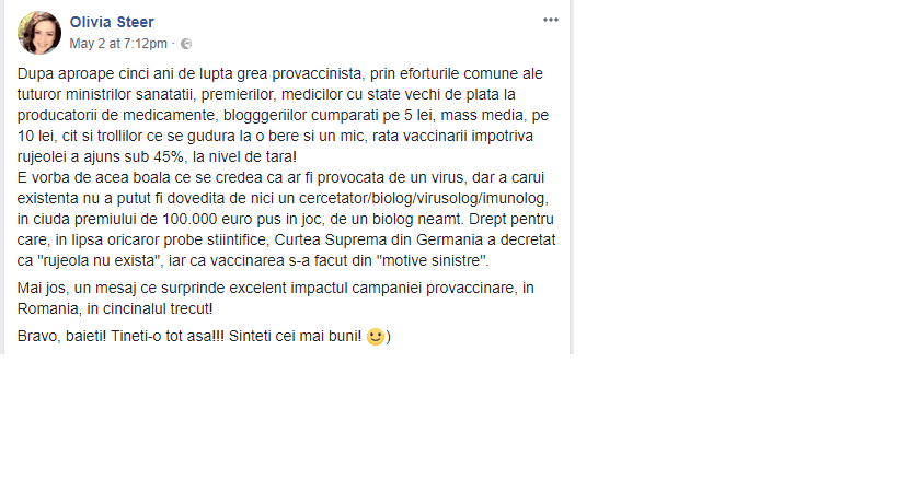 Într-o postare făcută pe pagina sa de Facebook în 2 mai, Olivia Steer afirmă că „în lipsa oricăror probe științifice, Curtea Supremă din Germania a decretat că «rujeola nu există»”.