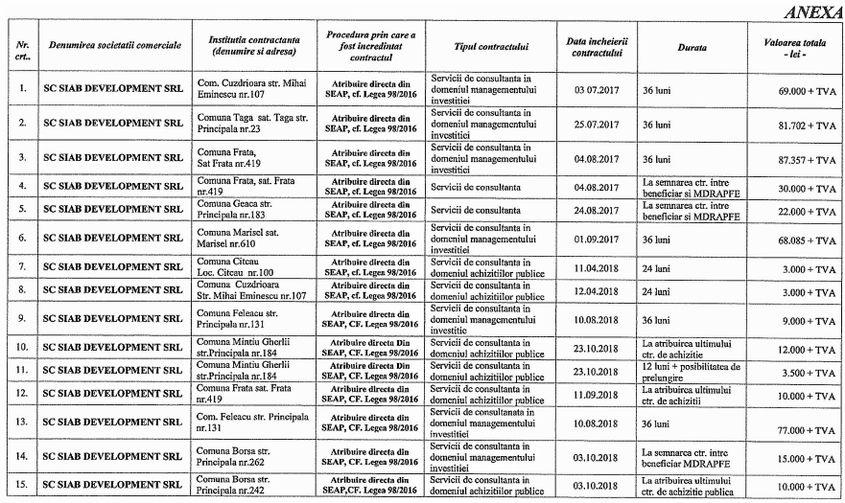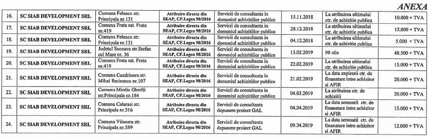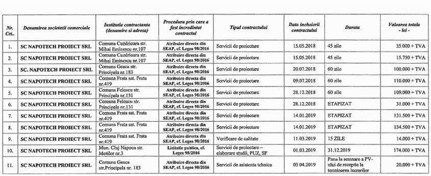 Valoarea totală a acestora este de 547.000 de lei, iar obiectul contractelor variază de la consultanță pentru achiziții publice la proiectare de lucrări sau verificarea calității lucrărilor.