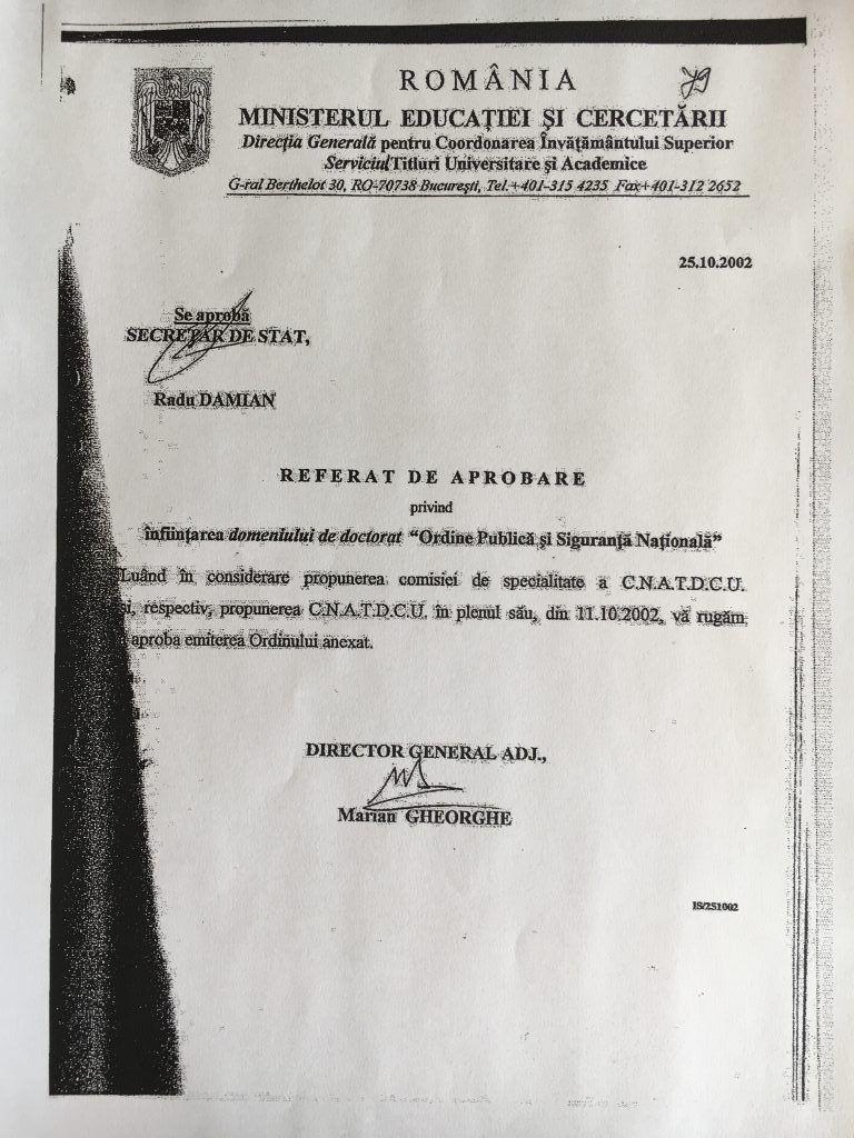 2002 va rămâne în istoria educației din România ca anul de înfiinţare a primului domeniu doctoral care nu corespunde niciunei ştiinţe: Ordine Publică şi Siguranţă Naţională.