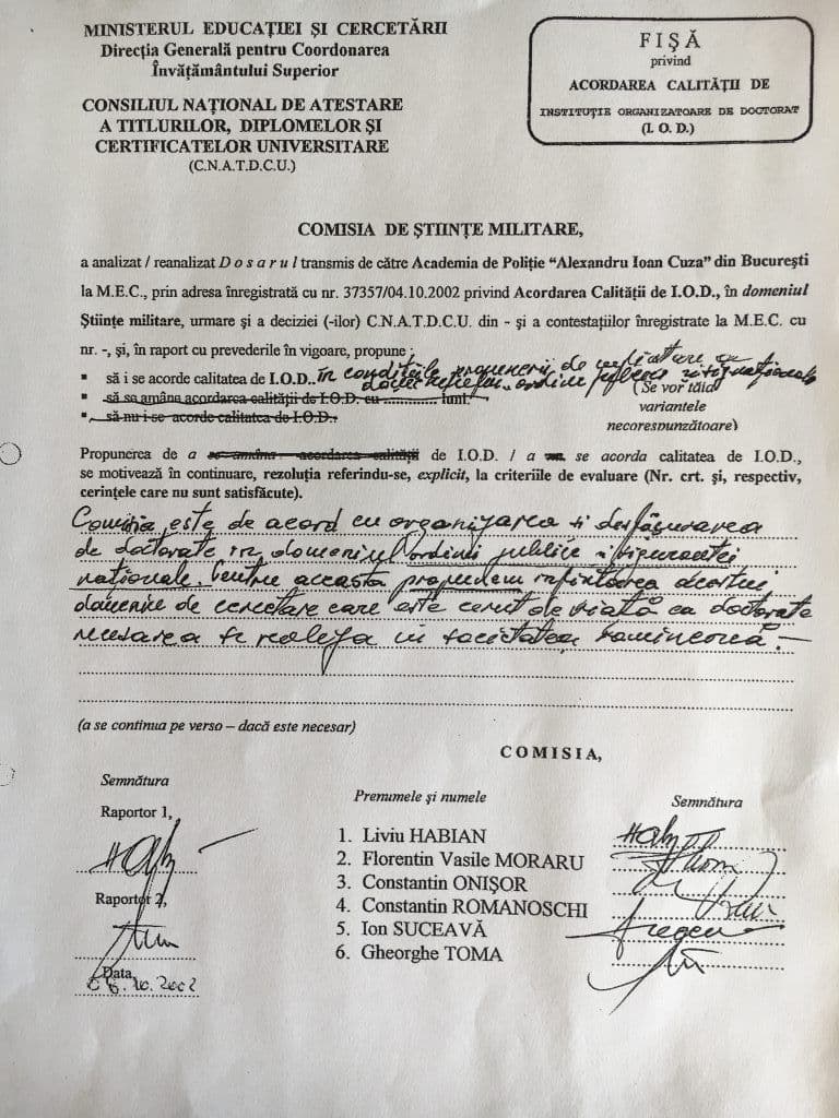 Motivarea comisiei de specialitate a CNATDCU a fost următoarea: „Comisia este de acord cu organizarea şi desfăşurarea de doctorate în domeniul Ordinii Publice şi Siguranţei Naţionale. Pentru aceasta propunem înfiinţarea acestui domeniu de cercetare care este cerut de viaţă (sic!), ca doctorate necesare a se realiza în societatea romînească (sic!)”.