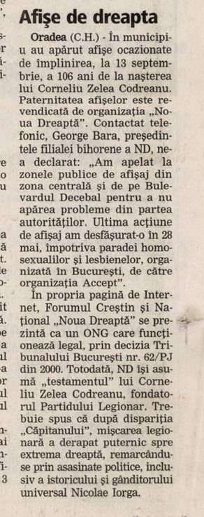 În 2005, presa locală îl identifica pe George Bara ca membru al organizației neolegionare Noua Dreaptă. Sursă foto: Jurnal Bihorean via Arcanum