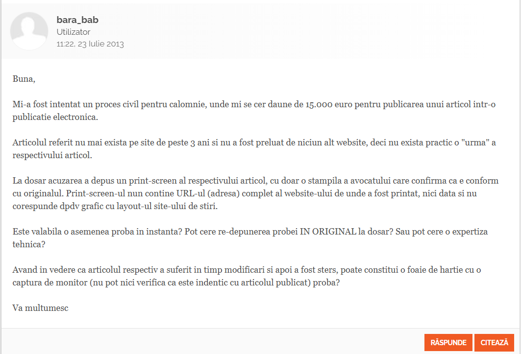 În 2013, antreprenorul îi întreba (folosind pseudonimul „bara_bab”) pe utilizatorii platformei avocatnet.ro dacă o instanță poate lua în considerare ca probă, într-un proces civil de calomnie, un articol scris și publicat de el în mediul online.