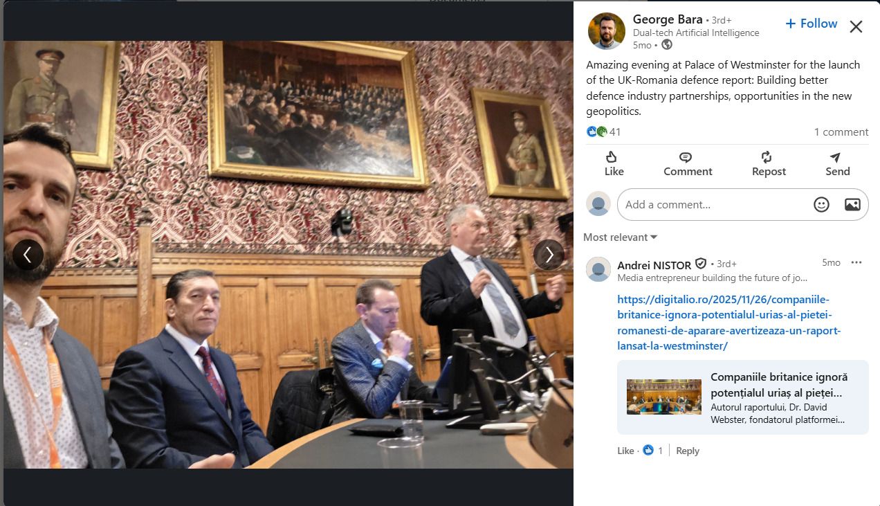 Într-o postare pe LinkedIn, George Bara se laudă cu participarea, în Parlamentul Britanic, la lansarea unui raport privind colaborarea României și Regatului Unit în materie de apărare. Foto: Captură de ecran LinkedIn